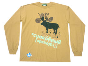 | 『おだやかな』 ゆったりとおだやかな気分で、ウシみたいなウマみたいな、鹿みたいな動物を描きました。ついでに角(つの)に 不思議な果実を実らせました。 斜めの文字は「おだやかな」という意味のロシア語です。 |