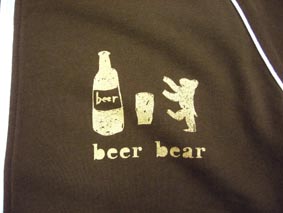 『ベア』 ベアーとビアー(ビール)のワンポイントイラスト。 プリントはビール色ということでゴールドです。 今からコップにビールをとくとくとくっと入れていっぱいするところです。冬のビールもいいですからね。 |