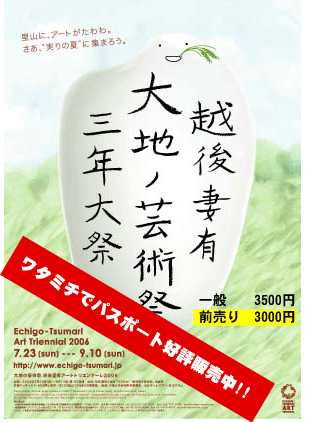 只今、ワタミチは 「大地の芸術祭にいがたサポーターズ会議」 情報発信基地として運営中。 いよいよ大地の芸術祭7/23日開幕です!! 前売りパスポートを購入予定の方はお早めに!! ●前売りパスポート 3000円(通常 3500円) これで全ての作品を見ることが可能になります。 お得な割引もついてます。会場について困らないように、 早めの購入をオススメします。 ![]() |
