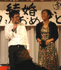 | 【一成さんおめでとう】 written by ハシモト 先週の一成に引き続き、昨日も一成さんが結婚式でした!おめでとう!! サコ一成の結婚式にもご出席いただきましたクボタ一成氏が、1週間違いでこれまた同じ五十嵐邸ガーデンで挙式。 で、昨日はハシモトとエンドヲとで2次会に参加させていただきました。 きれーな奥さんとステキなバンド演奏、それに楽しい仲間たちでいい2次会でした。 ま、ふだんはクボタさんって呼んでるんだけど、あえて一成つながりなとこを押してみようかと、タイトルで一成さんなんて書いてみました。 クボタさんについては、 ・サコの2次会で歌ってくれた人 ・エンドヲの2次会で歌ってくれた人 ・じゃがいも畑を管理してくれてる人 といえばピンとくる方も多いはず。なにかとお世話になってます。ほんとありがと、これからもお幸せにー!! 2006.10.22 |