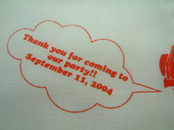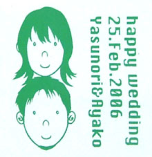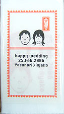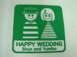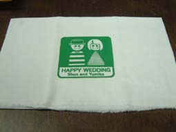 結婚式の引き出物に人気の「手ぬぐい」です。お二人の顔ををキャラクター化し、それに文字を加えてプリントします。かわいいのしも好評です。染め手ぬぐいに比べると納期も短く、低価格でお作りできます。しかし、染めとは異なりデザイン範囲に限りがあり、片面のみのプリントとなります。